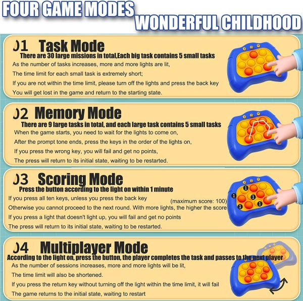 - 【Handheld Puzzle Game 】:There are 4 different modes of this fidget travel game. Level, Memory, Scoring, and Multiplayer modes.Keep kids entertained for hours with sound effects and flashing lights.